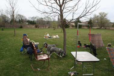 One of Sylvias boys showing how Tri-ball is done as the puppies look on.