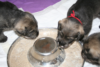 Its a big day when the pups get to try 'big dog food'. Puppy chop is blended into small bits and warm milk added to make the 'Royal Slop. It will help Ellie out as she wont have to nurse as much, especially with those sharp little teeth coming in. It will also help the pups to keep up their steady growth. The drawback is that they make a bigger mess and Ellie won't be as helpful at cleaning up. So its off the recycle to gather newspapers. |