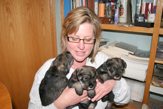 The pups turned three weeks. They are really starting to get around and show personality. They are all beautiful. Ellie is being a very good mother, but it won't be long and the boys will be getting on solid foods. They are starting to climb and get over the 'pig rail' ,,, so we will have to add height to the divider. It is fun to watch them start to play with each other. Our friend Linda from down south ... ok ... Des Moines came up to meet the guys for the first time. I think she likes them! |